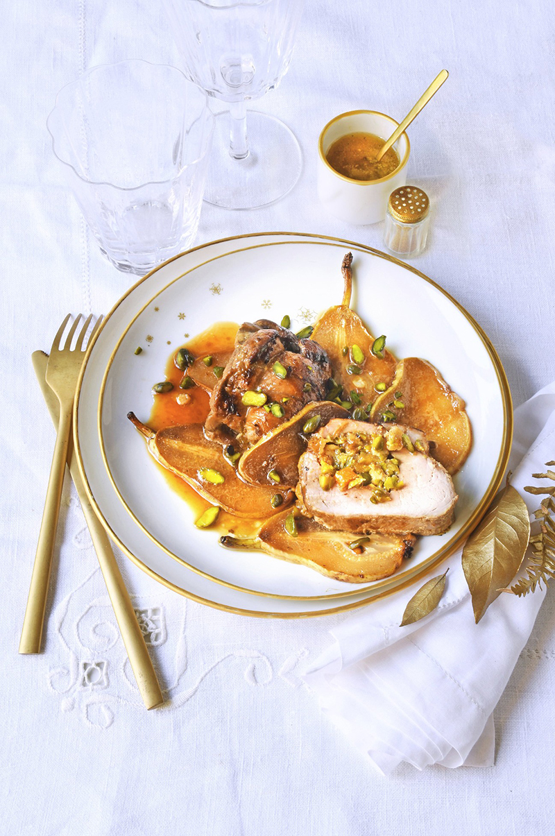 Filet mignon de veau farci au Beaufort et pistaches accompagné de poires