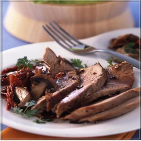 Une fois cuite, laisser reposer la viande quelques instants avant de la servir tranchée, accompagnée des tomates, des champignons et des quenelles de caviar d’aubergines généreusement arrosées du vinaigre caramélisé.