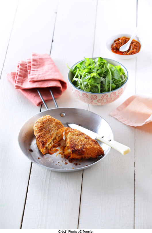 Filets de poulet farcis à la sauce Pesto Rosso Tramier et à la mozzarella, puis panés aux flocons d’avoine et au parmesan