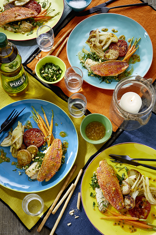 Filets de rouget, légumes printaniers, vinaigrette passion