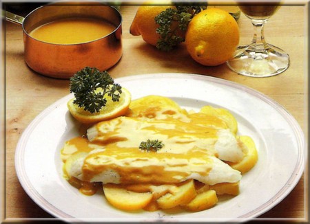 Servir les filets accompagnés des pommes de terre, nappés de la sauce et décorer de rondelles de citron et de persil.
