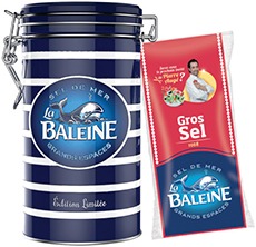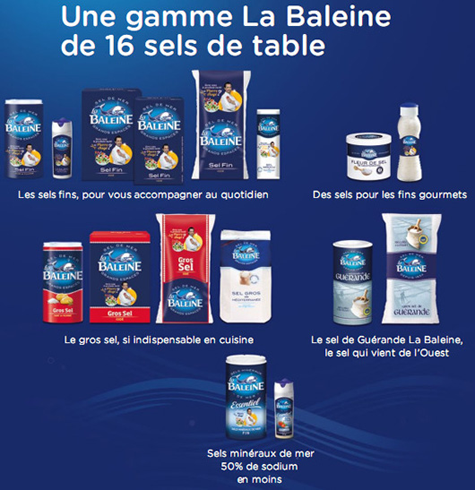 Depuis 1934, la marque La Baleine accompagne notre quotidien, relève le goût des aliments et de nos repas tout en préservant l’environnement naturel dédié à la production de son sel de mer. pionnière sur le marché du sel, elle a su établir une affinité avec ses consommateurs en imposant son emblème repré- sentée au fil des années sous les traits d’un animal sympathique. Aujourd’hui, la marque propose une gamme de 15 produits : sel de mer fin, gros sel de mer, gros sel gris de Guérande ou encore Fleur de sel de méditerranée… La Baleine s’engage dans le bien-être et la santé de ses consommateurs en jouant un rôle actif en proposant des sels iodés et des sels fluorés comme le recommande le programme national nutrition santé.