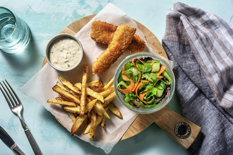 Servez les frites et le lieu pané dans les assiettes. Placez la sauce ravigote et la salade à côté.