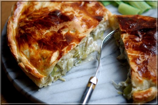 5.Mettre des petits cailloux ou des haricots pour empêcher la pâte de lever et faire cuire au four pendant 20 min. Garnir la pâte du mélange poireaux, béchamel, saupoudrer de fromage râpé et faire gratiner.
