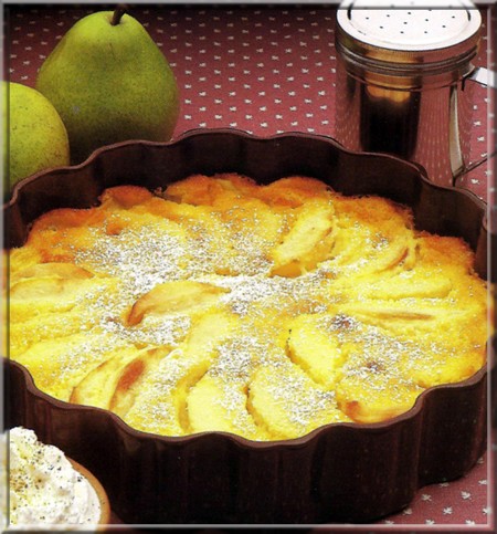 1.Peler, épépiner et couper les poires en tranches. Les disposer en cercle dans un moule à flan de 23 cm de diamètre, beurré avec la moitié du beurre. Les arroser de jus de citron.
