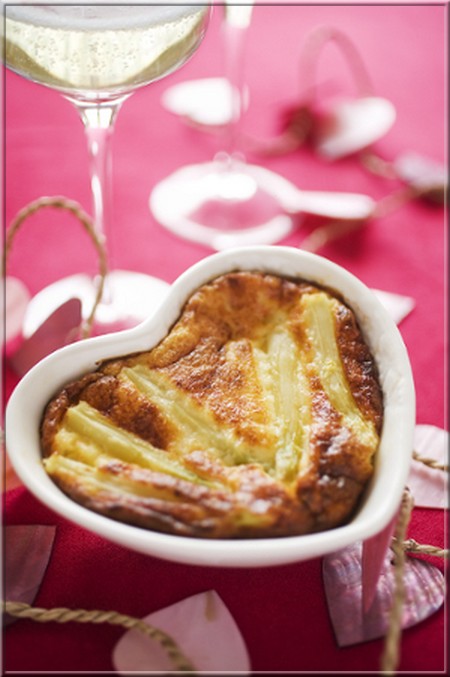 4- Beurrez 2 jolis moules individuels (en forme de cœur pour un diner en amoureux) et versez-y la préparation aux deux tiers. Répartissez les pointes d'asperges, salez et poivrez.