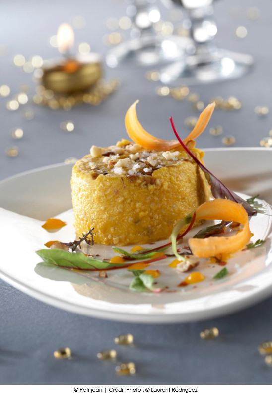 Flan de quenelles de volailles, carottes et noisettes craquantes