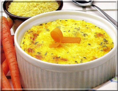 2.Mélanger le riz avec les carottes, les œufs battus, le lait, le gruyère, le thym, du sel et du poivre. Verser dans un moule à flan beurré. Parsemer de gruyère.