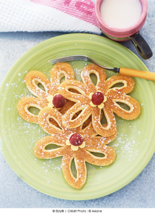 ⑥• Versez la pâte en dessinant une fleur dans la poêle. Retournez la fleur dès qu’elle est bien dorée.