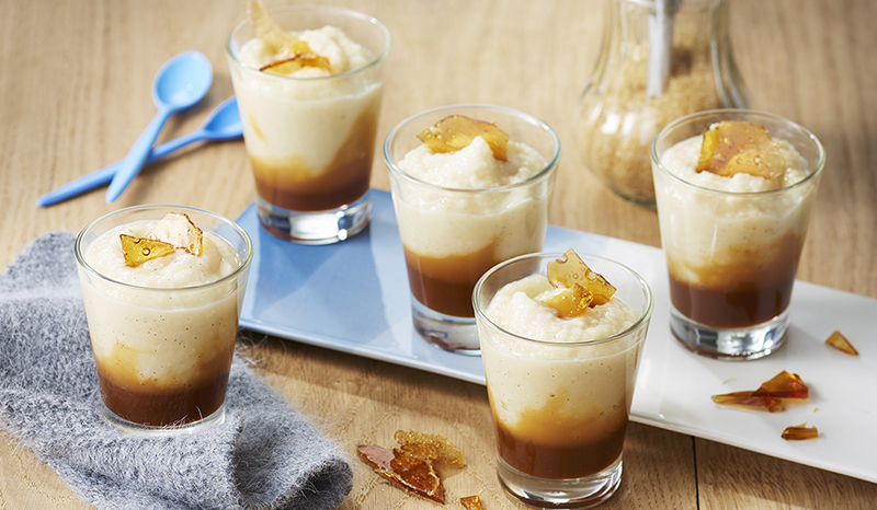 ③• Enlevez la gousse de vanille. Dans 4 ramequins en verre, versez 2 cuillères à soupe de caramel liquide et ajoutez la Floraline.