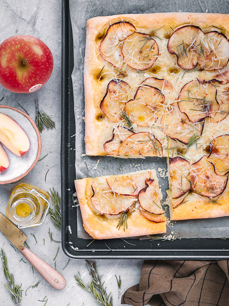 « Parce que la focaccia, ça ne se mange pas qu’en été ! Une recette originale créée avec amour pour l’association Pink Lady® où tous les producteurs sont engagés dans une démarche de production responsable pour offrir une qualité optimale. C’est ainsi que j’apprécie la pomme Pink Lady® pour son parfum, ses saveurs et sa tenue en cuisson. »
