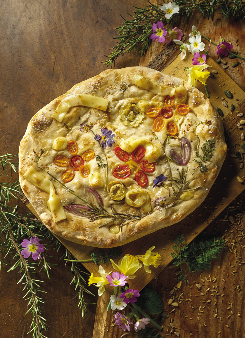 ②• Laisser pousser 1h30 à 2h à température ambiante, la pâte doit doubler de volume. Étaler dans un plat avec de l’huile d’olive sous la pâte et sur la pâte, planter les doigts dedans pour dégazer et laisser pousser de nouveau 30 minutes. On peut faire le décor pendant cette deuxième pousse ou le faire après. Faire chauffer le four à 200°C (Th.6-7) puis enfourner pour 20 minutes environ.