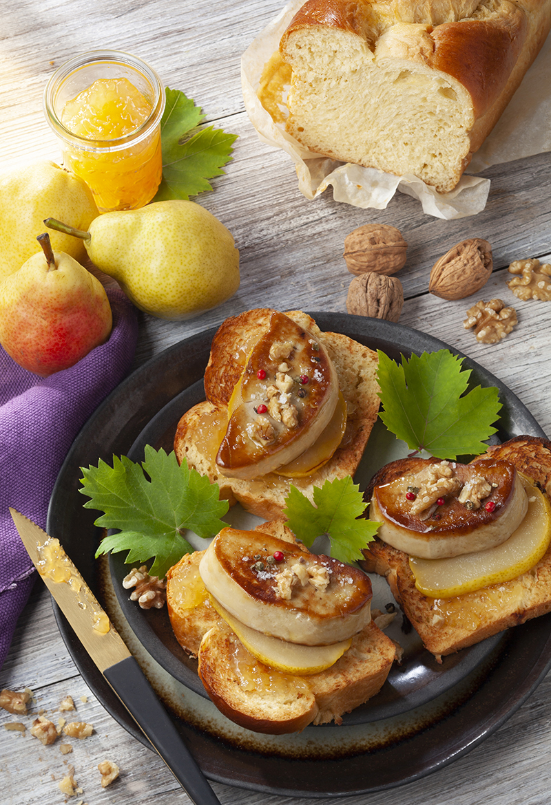 Foie Gras poêlé aux poires caramélisées, chutney de gingembre, cerneaux de noix et brioche Vendéenne