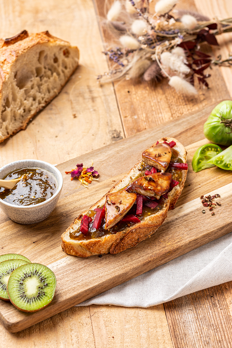 Déposer les lamelles de kiwi de France frais sur les tartines, puis le foie gras poêlé et parsemer de crumble de pain d’épices grillé.