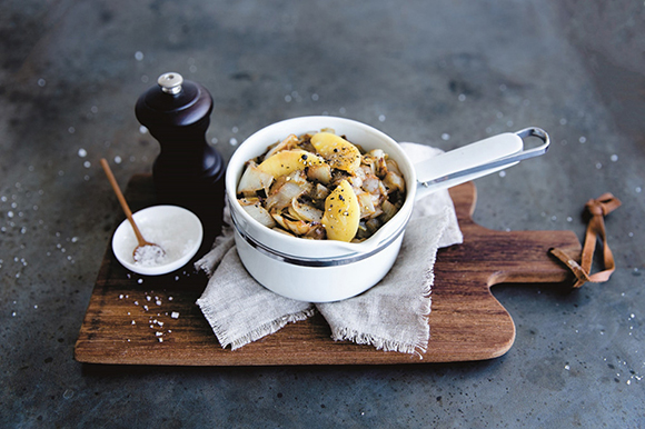 ③• Petit à petit, ajoutez les Perles émincées, elles doivent prendre une belle couleur dorée. Quand toutes les Perles émincées sont dans la poêle, ajoutez les dés de pomme. Salez et poivrez.