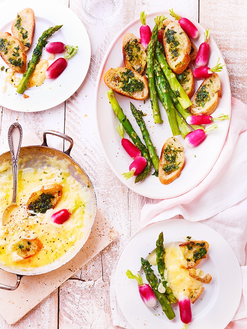 Servez sans attendre avec le pain aux herbes, les asperges et les radis.