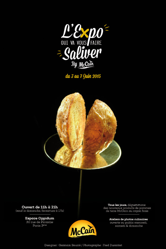 Pour faire connaître sa gamme de produits au rayon frais, McCain met les petits plats dans les grands en créant « L’expo qui va vous faire saliver ». La marque canadienne a missionné le photographe-designer Germain Bourré, autour d’un projet artistique : imaginer et sublimer un produit du quotidien, l’emblématique pomme de terre ! Ancrée dans la tendance du « food porn », l’exposition révèlera 12 photos inédites à l’esthétisme gourmand, jouant sur la lumière et les textures.