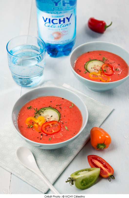 LE + VICHY : en plus de ses minéraux, l’eau VICHY Célestins va contribuer à réduire à réduire l’acidité de la tomate grâce aux propriétés anti-acide de ses bicarbonates.