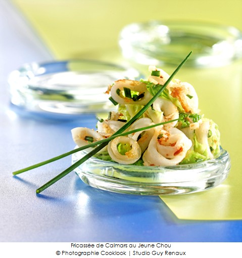2• Dans un wok ou une large poêle bien chaude, faire sauter les calmars avec l’ail haché pendant 5 minutes dans l’huile d’olive. Ajouter les lanières de chou, saler et poivrer.