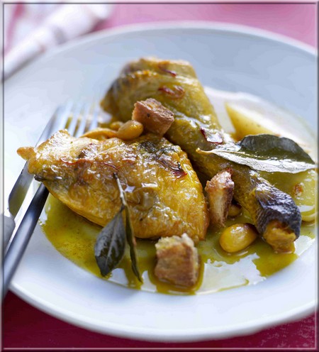 4- Avant que l’oignon ne colore, ajoutez les morceaux de pintade puis versez le vin blanc et le bouillon de volaille. Incorporez les amandes et le pain réservés au préalable et laissez mijoter à feu doux jusqu’à ce que la viande se détache des os sans difficulté (30 minutes).