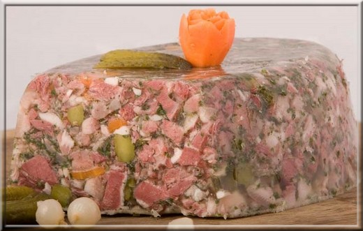 3.Retirer la viande de la marmite et désosser la tête. Hacher toute la chair grossièrement au couteau, y compris oreilles, en en récupérant le maximum. Trancher la langue en petits morceaux. Couper les carottes et les cornichons en petits morceaux et les ajouter à la viande pour donner de la couleur à la tranche de terrine.