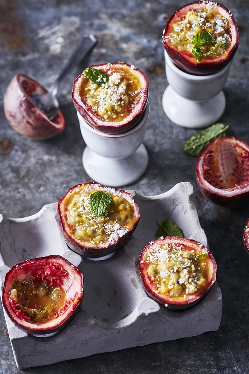 Fruit de la passion à la coque saupoudré de noix de coco