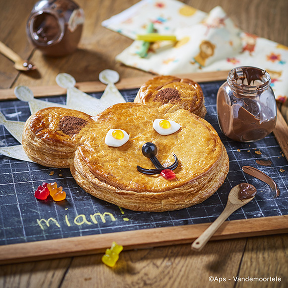 – Garnir en forme de tête d’ours avec la pâte à tartiner sur environ 1,5 cm de hauteur, déposer la fève sur un bord (pour minimiser le risque de tomber dessus en coupant la galette !).