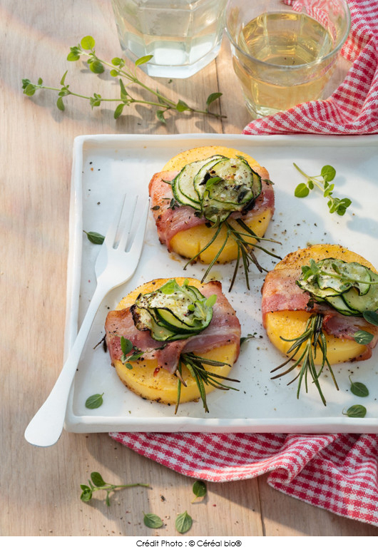 ②• Enroulez chaque galette de polenta d’une tranche de lard fumé.
