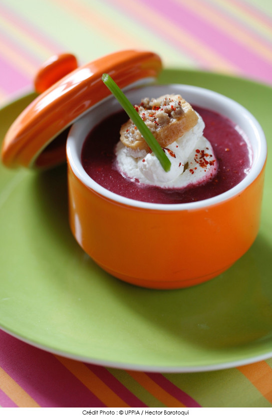 Servir le gaspacho de betterave avec la crème fouettée, saupoudrer très légèrement de piment, décorer de queues d’aneth.