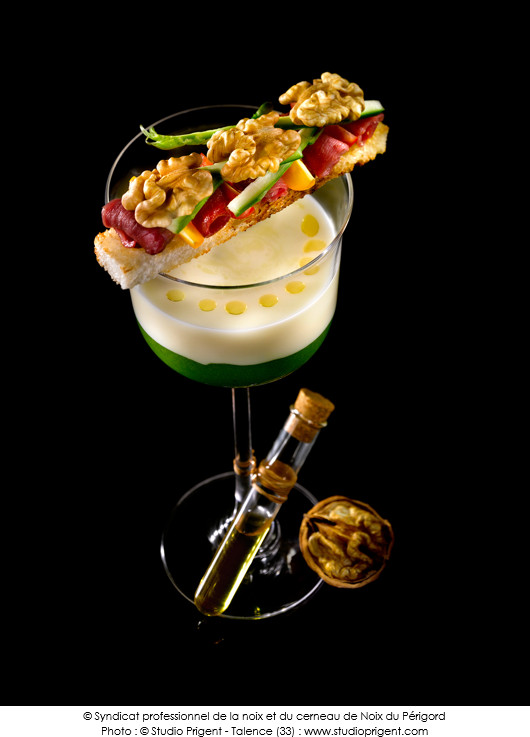 Servir la verrine avec le crostini aux Noix du Périgord et accompagner-la avec une pipette d’huile de noix du Périgord pour assaisonner à la convenance de chacun.