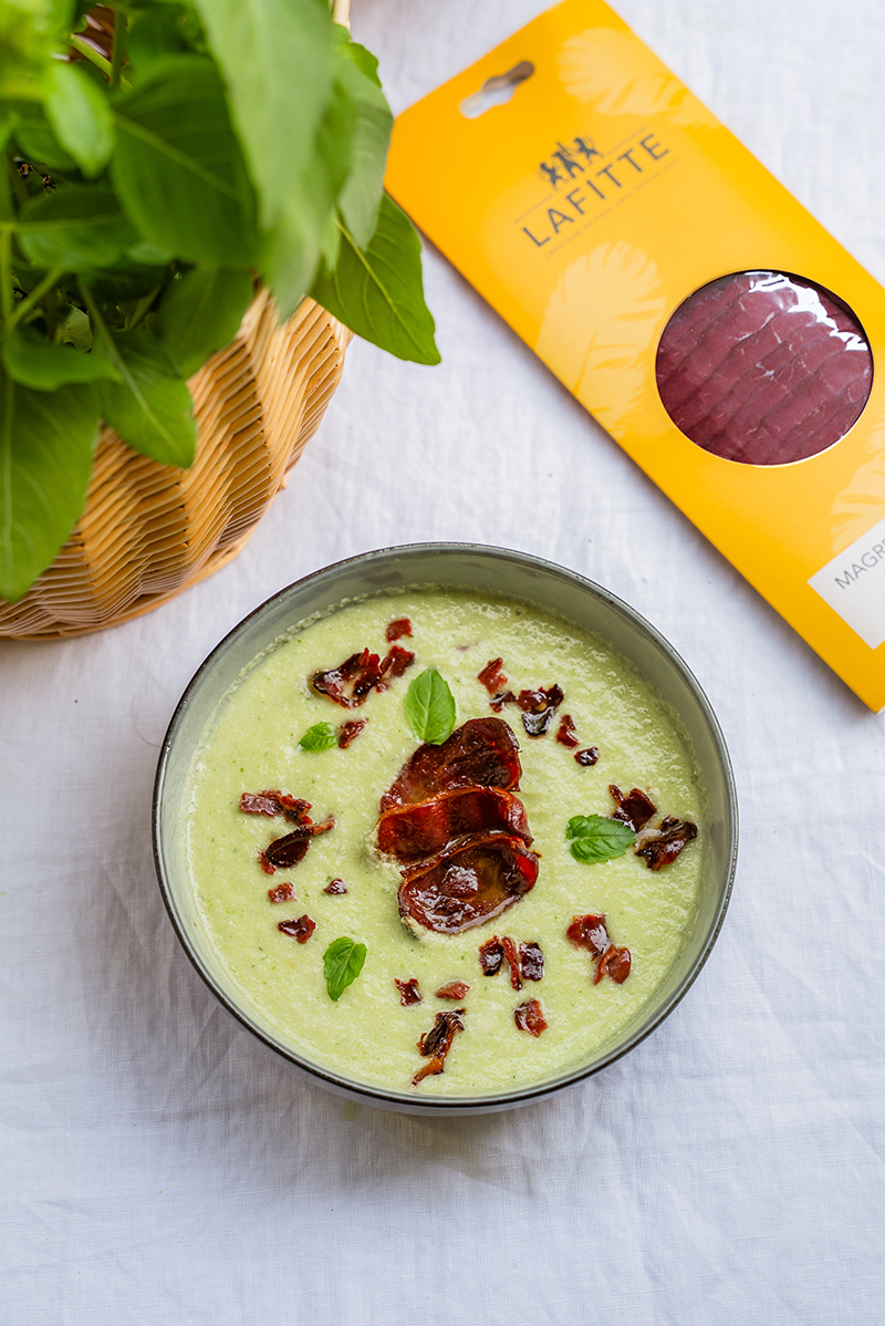 Gaspacho vert et chips de Magret Fumé