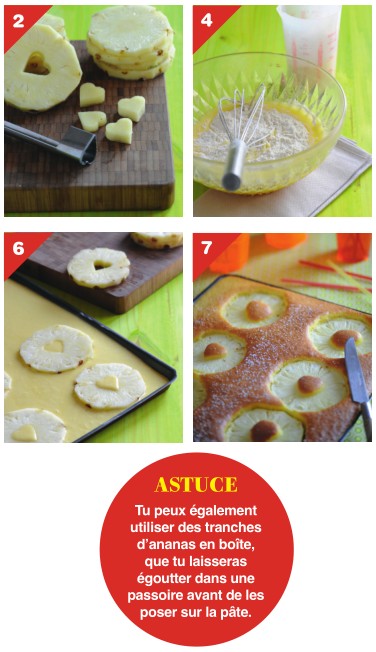 6• Dispose les tranches d’ananas sur la pâte, à intervalles réguliers, puis enfourne ton gâteau pour 20 min (il ne doit pas trop colorer).
