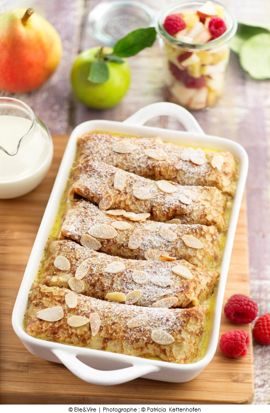 ⑤• Mélanger l’œuf avec le sucre restant, la poudre d’amandes et la Crème Liquide 35% MG Elle & Vire, puis verser autour des crêpes. Disposer des amandes effilées, saupoudrer de sucre glace et enfourner 25 min.