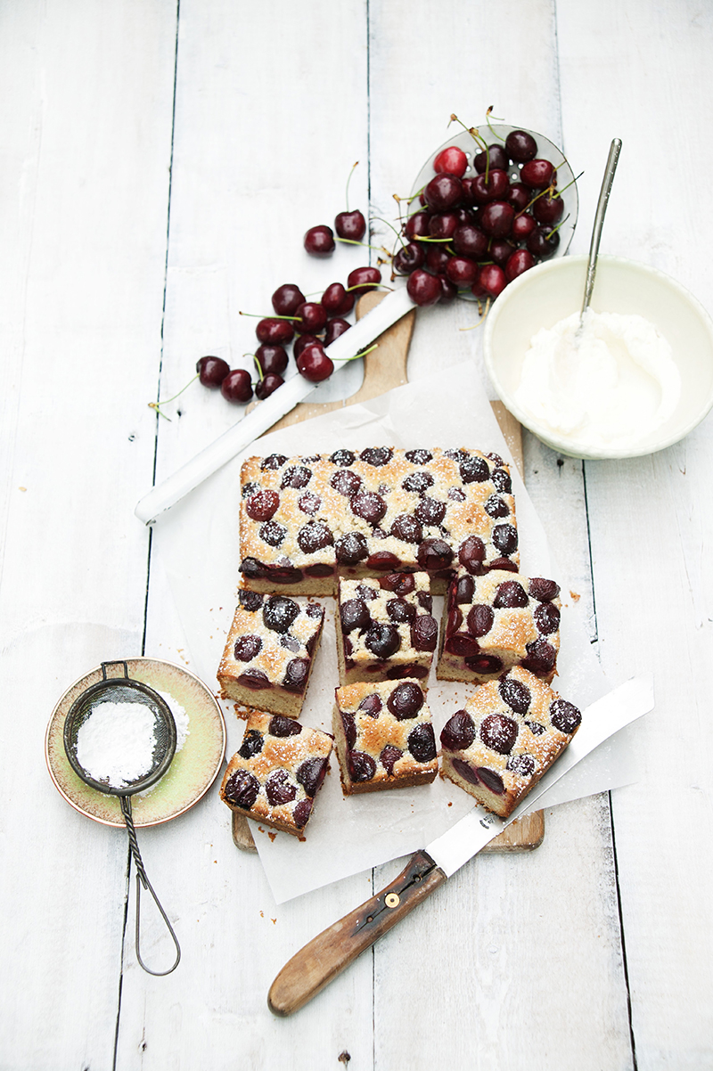 ①• Préchauffez le four à 160°C (thermostat 5/6). Lavez, séchez et dénoyautez les cerises. Beurrez et farinez un grand moule rectangulaire.