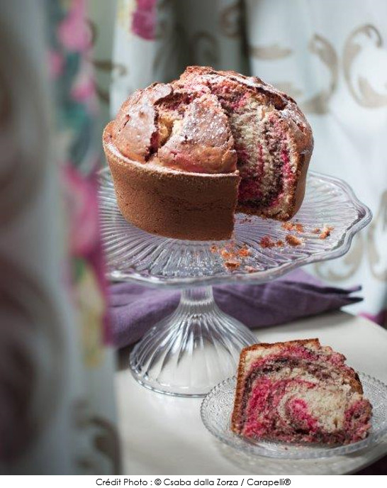 ③• Versez un tiers de la pâte dans le moule à charnière et un tiers dans un bol propre. Ajoutez dans l’un des deux bols le cacao et le lait, de façon à avoir + ou – la même consistance de la pâte blanche. Versez la pâte au cacao au-dessus de la blanche puis couvrez avec la pâte blanche restante. Placez la lame d’un couteau dans la pâte et faites le tour du moule 2-3 fois pour créer l’effet marbré. Si vous utilisez le colorant rose pour obtenir l’effet de la photo, ajoutez-le au bol contenant la pâte blanche.
