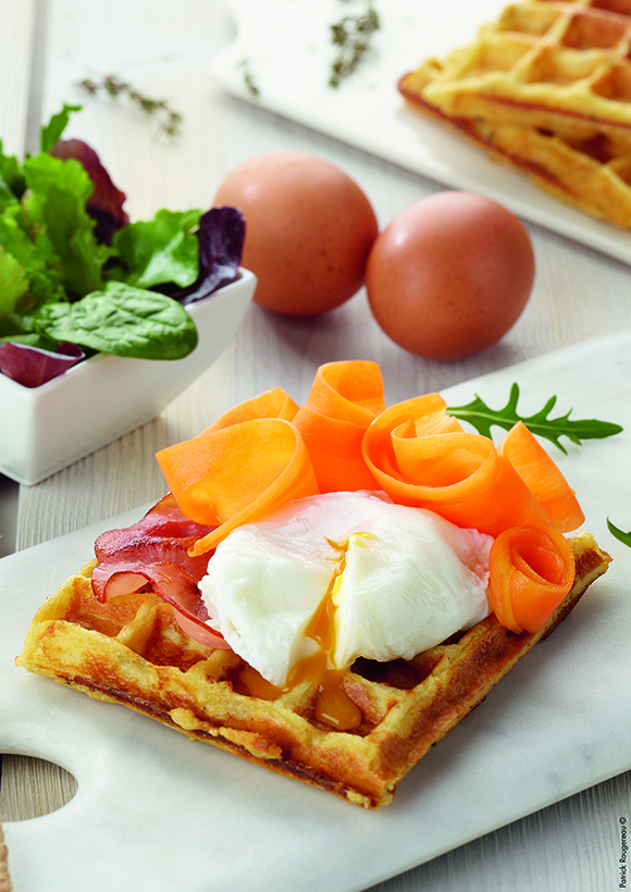 ⑬• Disposez chaque gaufre de pain perdu dans une assiette. Répartissez dessus les tagliatelles de carottes, une tranche de lard, un œuf poché.