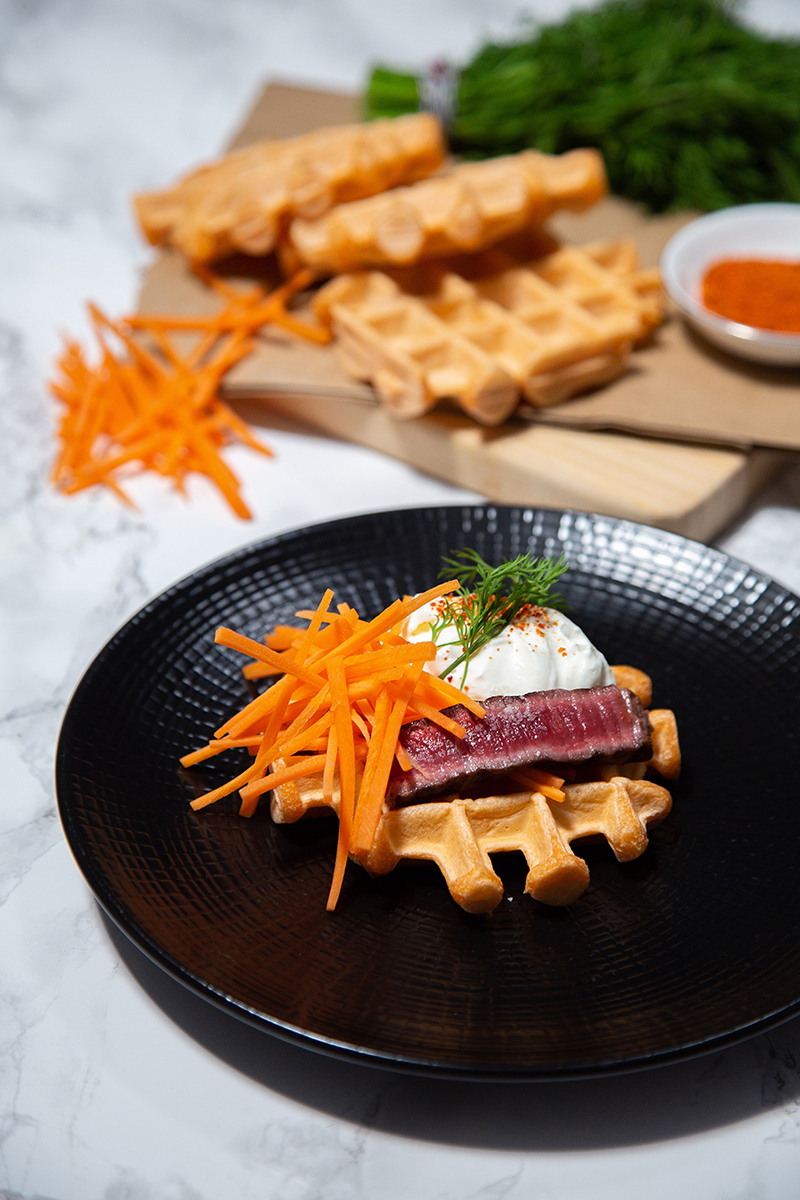 Mettre la gaufre sur le côté de l’assiette, la crème d’aneth par-dessus, et la viande sur le côté de la gaufre avec la julienne de carottes.