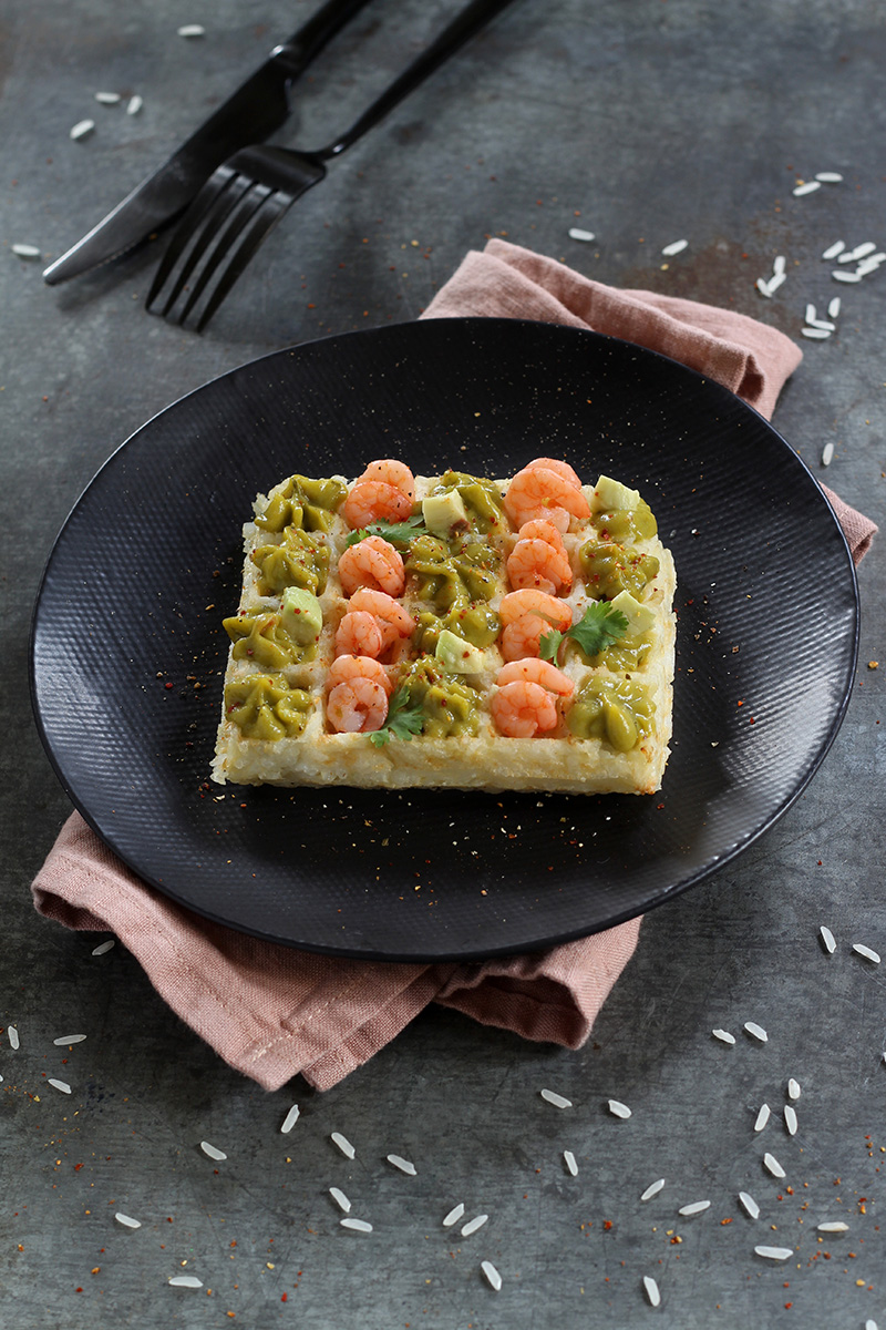 Gaufres de riz à la crème d’avocat et petites crevettes