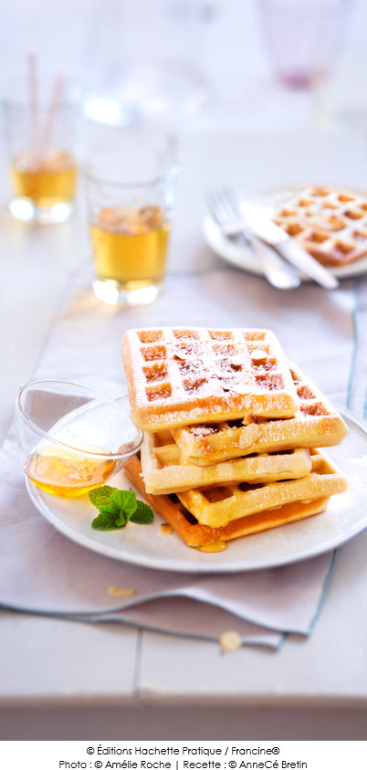 Servez vos gaufres bien chaudes arrosées de miel, parsemées d’amandes effilées et de feuilles de menthe.
