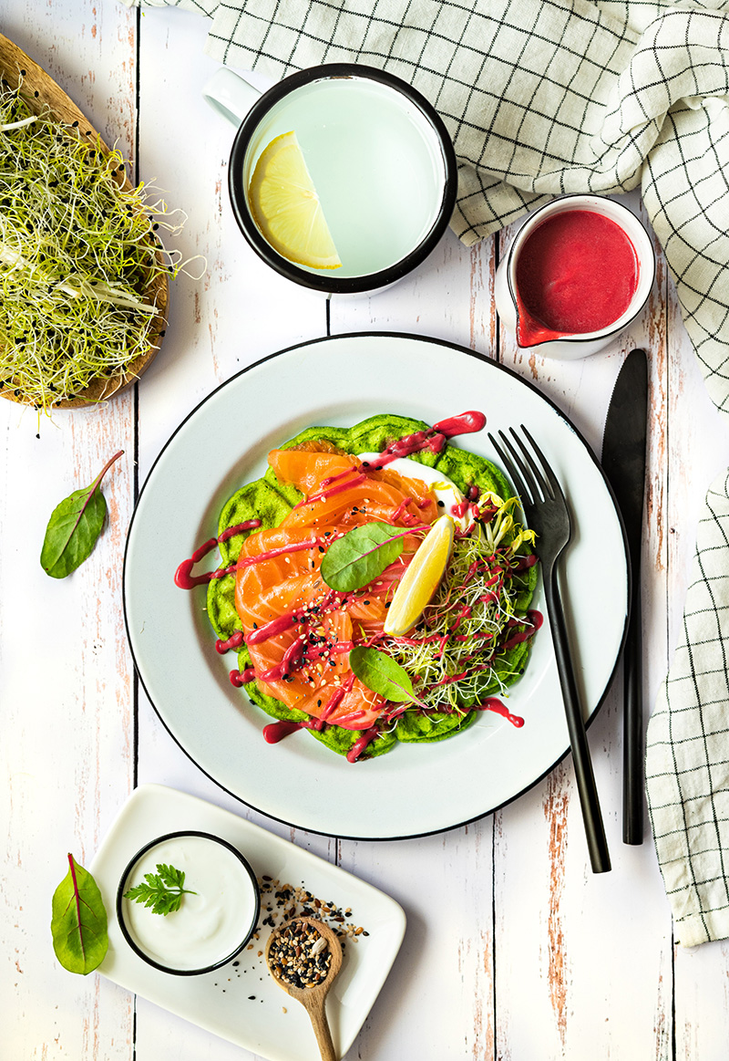 Gaufres vertes à la Truite Fumée & sauce aigre-douce à la betterave