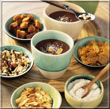 9.Disposer les dés de pain d’épices, les noisettes et les amandes grillées, la noix de coco râpée et les corn-flakes dans des raviers différents.