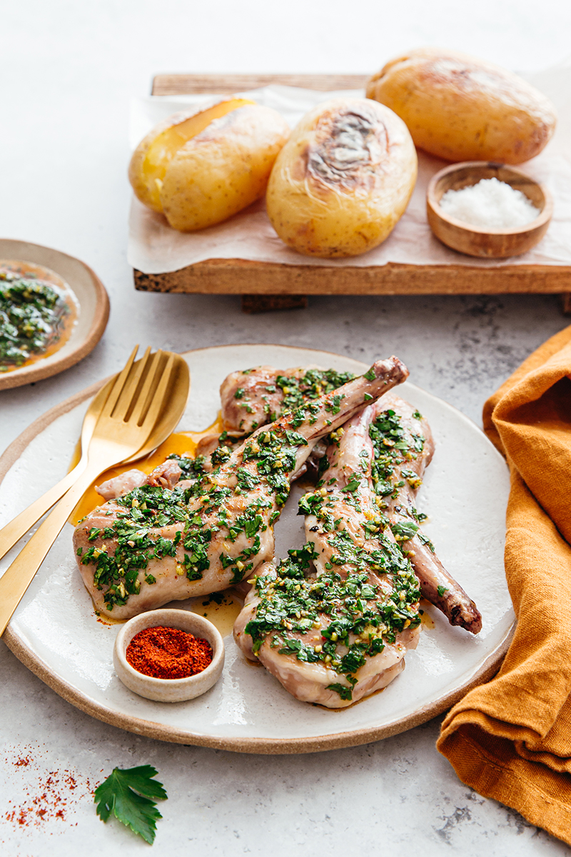 Découvrez notre délicieuse recette de gigolettes de lapin savamment accompagnées d'une sauce chimichurri aux saveurs irrésistibles. Un mariage parfait entre tendresse et audace culinaire à déguster sans modération.