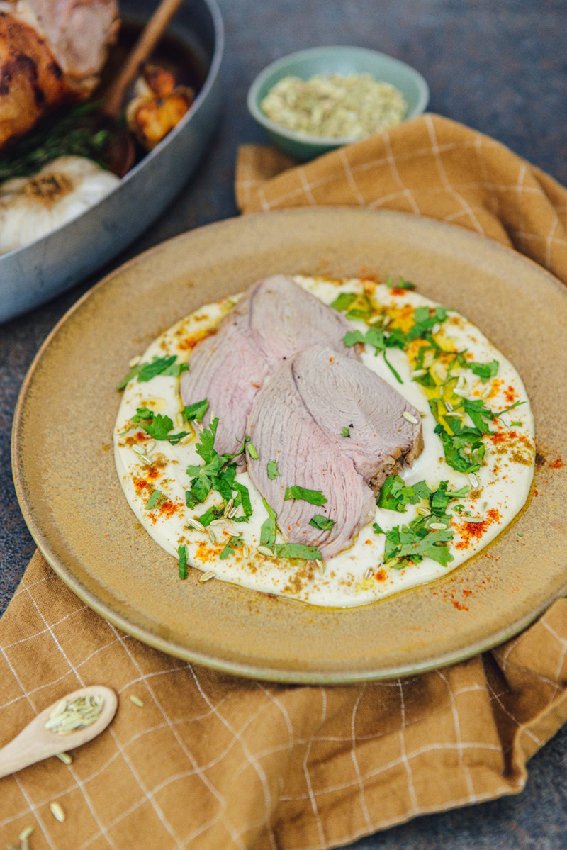Gigot d’agneau rôti à l’ail, houmous haricots blancs/coriandre