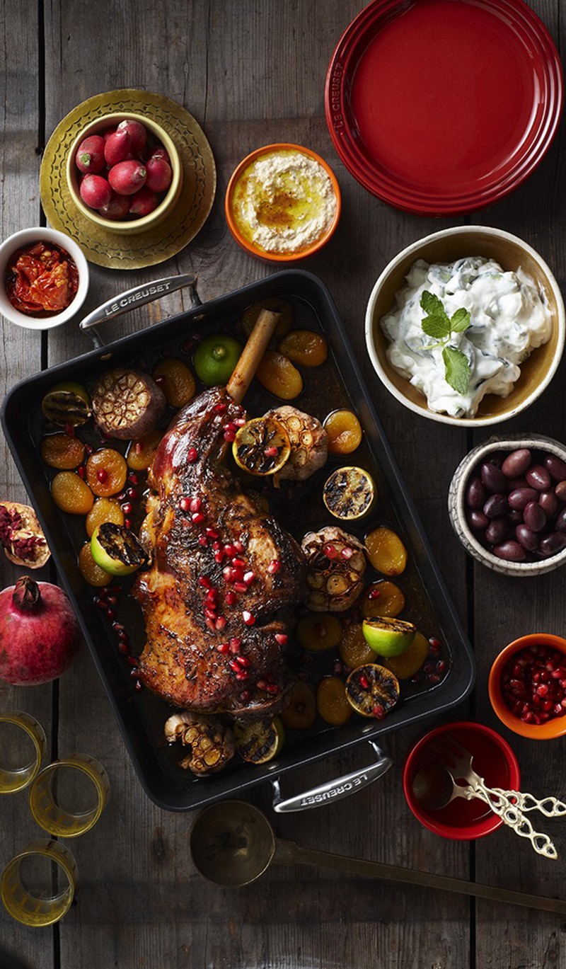 – Faites frire les citrons verts sur un gril anti-adhérent et placez-les dans le plat à rôtir. Répartissez les graines de grenade sur la viande et servez avec de l'houmous, du concombre au yaourt, des olives, des tomates séchées et des radis frais.