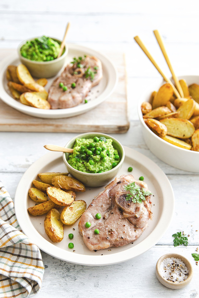 Servir de suite avec le houmous de petits pois et les pommes de terre sautées.