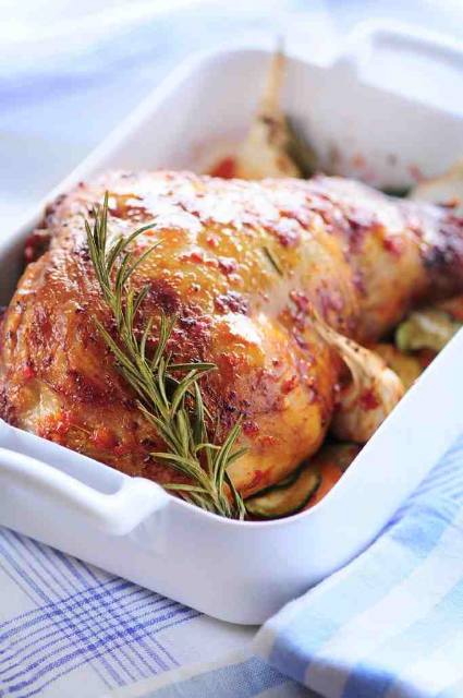 6- Placer le gigot d’agneau sur les légumes et déposer la branche de romarin restante sur la viande.