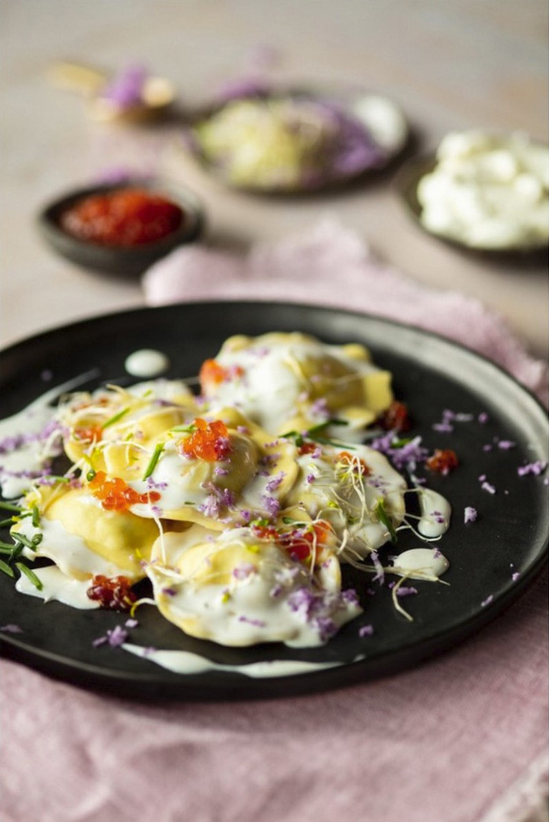 ④• Égoutter doucement les Girasoli Artichauts Giovanni Rana et les disposer sur les assiettes : verser la sauce mascarpone, et disposer avec délicatesse les œufs de saumon, un peu de chou-fleur râpé.