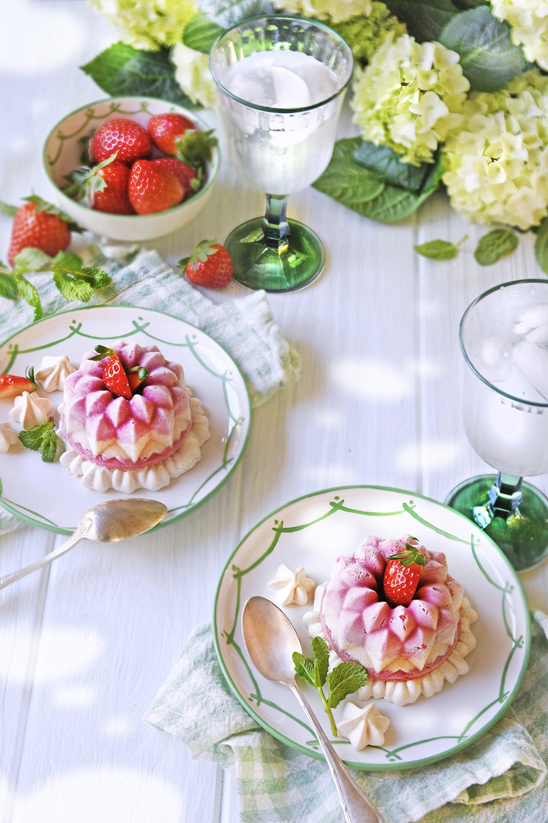 Au moment de servir, démoulez les glaces sur la meringue, décorez de fraises et de quelques feuilles de menthe.