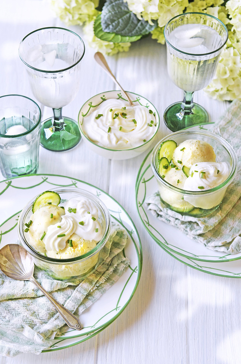 Servez deux boules de glace par personne, décorées de rondelles de concombre, un peu de chantilly et parsemez de ciboulette.