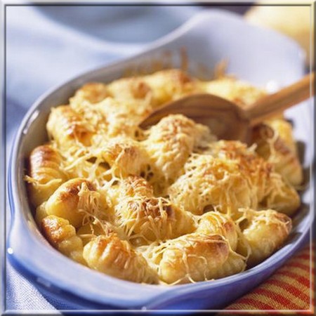 6.Plongez les gnocchis dans l'eau bouillante salée pendant 5 minutes. Égouttez-les et versez-les dans u plat à four. Faites fondre le reste de beurre et versez-le sur les gnocchis. Parsemez de gruyère râpé et enfournez. Faites gratiner 15 minutes.